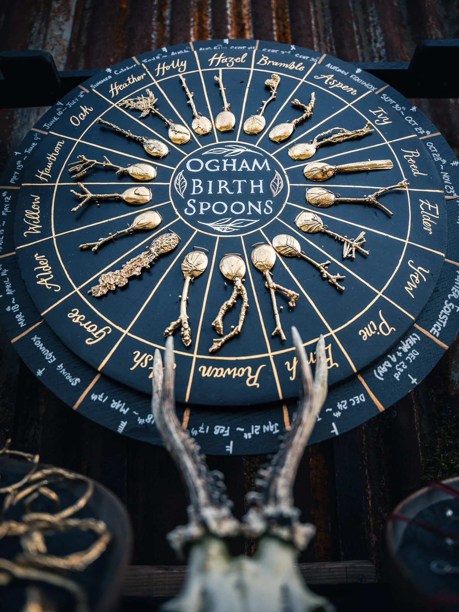 brass spoons crafted from the ancient Ogham Tree Calendar — where every tree corresponds to a unique time of the year.